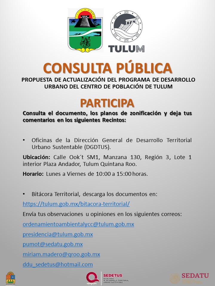 La Bitácora Territorial, es un instrumento electrónico de registro público de los avances del Proceso de la Planeación Urbana y Ordenamiento Territorial del Municipio de Tulum. Así mismo, se registra, selecciona, analiza y muestra la información urbanística y territorial que incide en los centros de población y da seguimiento a la gestión de los instrumentos.